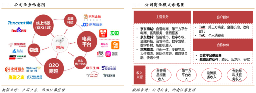 經(jīng)典案例:根據(jù)公司公告、西南證券等綜合資訊表明,經(jīng)過(guò)數(shù)十年的發(fā)展,京東商城逐漸發(fā)展成為國(guó)內(nèi) B2C 市場(chǎng)的頭部綜合型網(wǎng)絡(luò)零售商。2013年3月,京東去商城化,全面改名為京東,開(kāi)始淡化電商色彩,為公司在物流、金融以及互聯(lián)網(wǎng)科技等領(lǐng)域的拓展做鋪墊。