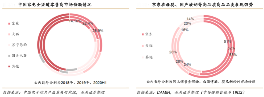 經(jīng)典案例:根據(jù)中國(guó)電子信息產(chǎn)業(yè)發(fā)展研究耽、西南證券、CAMIR等綜合資訊表明,京東持續(xù)深耕 3C 數(shù)碼、家用電器市場(chǎng),市場(chǎng)份額穩(wěn)步提升。根據(jù)中國(guó)電子信息產(chǎn)業(yè)發(fā)展研究院相關(guān)報(bào)告,2018 年、2019 年、2020H1 京東分別占據(jù)中國(guó)家電全渠道零售商 14.1%、22.4%、 28.9%的市場(chǎng)份額,線上市場(chǎng)份額均保持在60%以上。這正是其推進(jìn)科技型產(chǎn)業(yè)品牌建設(shè)結(jié)出的碩果。