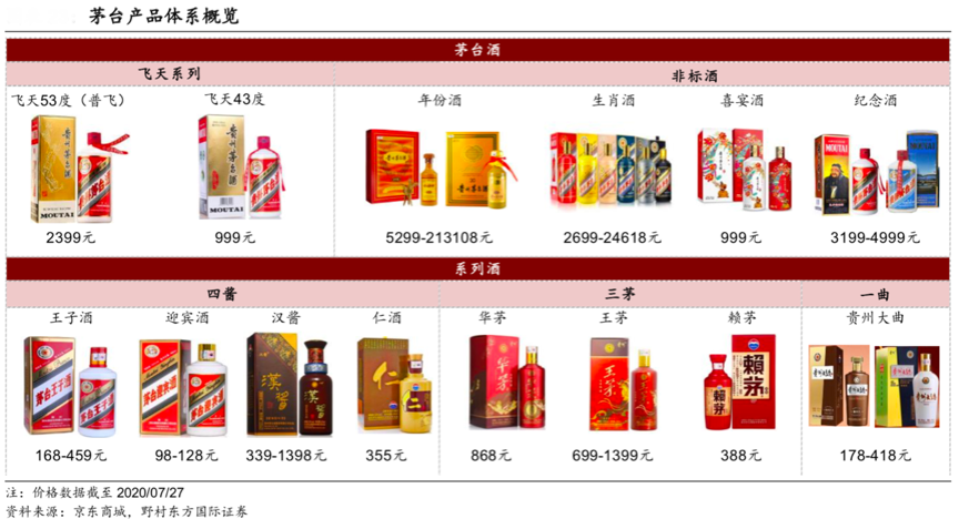 經典案例:根據京東商城、野村東方國際證券等綜合資訊表明,茅臺旗下主要有茅臺酒(53 度普通飛天茅臺、低度茅臺酒,以及附加價值更 高的非標酒包含生肖酒、定制酒、紀念酒等)與系列酒(一曲三茅四醬,“一曲” 即貴州大曲,“三茅”即賴茅、王茅以及華茅,“四醬”則為茅臺王子酒、茅臺迎賓酒、漢醬酒以及仁酒)。