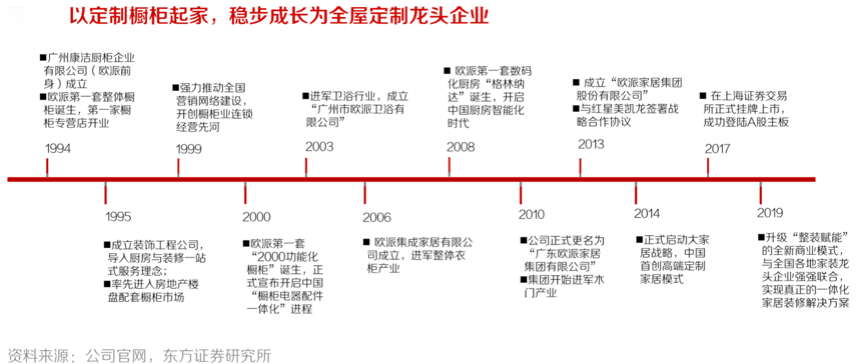 經典案例:根據公司官網、東方證券研究所等綜合資訊表明,歐派家居成立于1994年,由定制櫥柜起步,在之后的 25 年里逐步向全屋產品延伸,分別于2003年、2006年、2010年進軍衛浴、衣柜及木門產業,并于2014年正式啟動大家居戰略,穩步成長為國內規模領先的全屋定制龍頭企業。