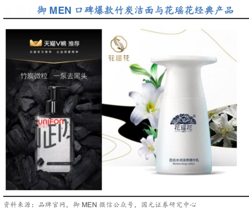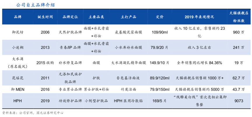 經典案例:根據公司官網、國元證券研究中心等綜合資訊表明,御泥坊公司“多品牌架構”完整,主品牌御泥坊依然以面膜為主打,小迷糊重點定位年輕大學生人群;大水滴由原臺灣品牌薇風改名升級而來,緊扣“熬夜肌,大水滴”的概念;花瑤花主打民族美學概念,聚焦無添加護膚品;御 MEN 定位尚在培育期的男士護膚賽道;HPH 切入高景氣的功能性護膚賽道。