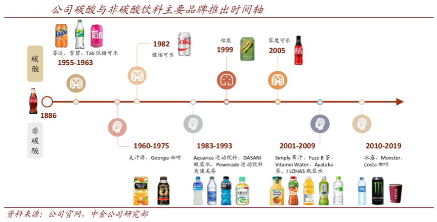 同時,根據公司官網、中金公司研究部等綜合資訊表明,其于2017年提出要成為“全品類飲料公司”的愿景。2018 年公司共推出約 600 個新產品,其中超過 400 個為非碳酸產品,新品銷量貢獻從 2015 年的 9%升至2018年的17%。