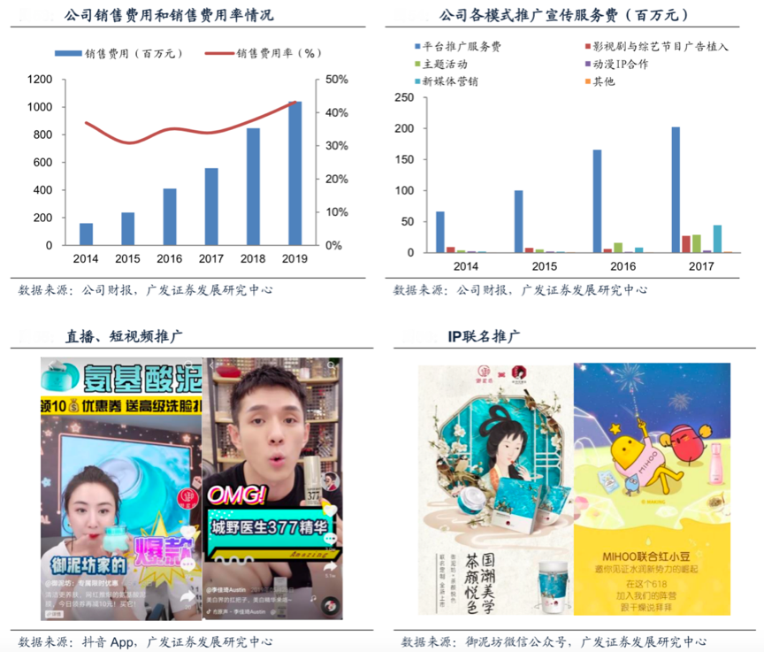 經典案例:根據公司財報、廣發證券發展研究中心等綜合資訊表明,御淪坊加強了與抖音、小紅書、嗶哩嗶哩等平臺的合作,并通過短視頻植入、網紅直播等方式強化了新媒體的推廣及內容營銷,傳遞公司品牌價值。2019 年公司與李佳琦直播合作47次,總計觀看量超4,000萬人次,與薇婭直播合作超過30 次,短視頻投放次數超過1200余條,合作達人超700人。