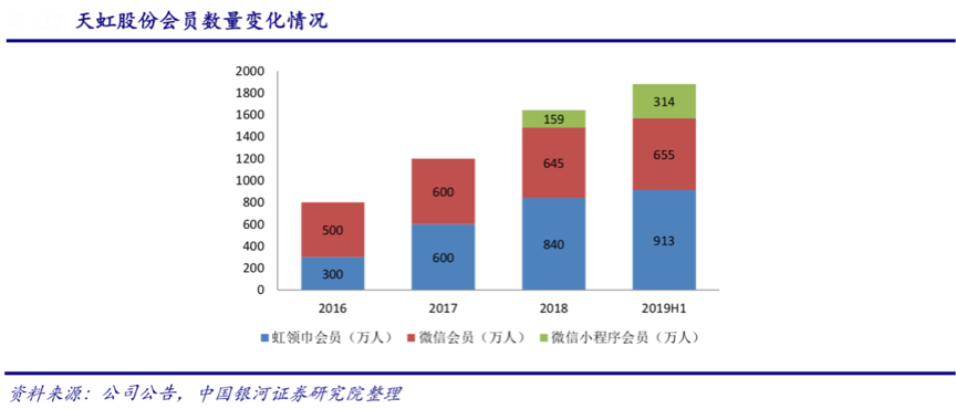 經(jīng)典案例:根據(jù)公司公告、中國銀河證券研究院等綜合資訊表明,2016年至 2019H1,虹領(lǐng)巾會(huì)員數(shù)實(shí)現(xiàn)了從300 萬到 913 萬的高速增長(zhǎng),同時(shí)微信會(huì)員也在 2019H1 達(dá)到 655 萬人,2018年開始新增微信小程序的會(huì)員也在半年時(shí)間內(nèi)從 159 萬 人提升至 314 萬人。億余人次通過天虹 APP 交互獲取信息或消費(fèi),堅(jiān)厚的線上會(huì)員基礎(chǔ)對(duì)于支撐公司未來線上業(yè)務(wù)發(fā)展、輔助線下銷售增長(zhǎng)均具有重要作用。