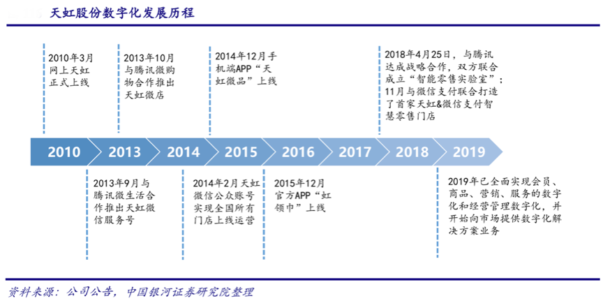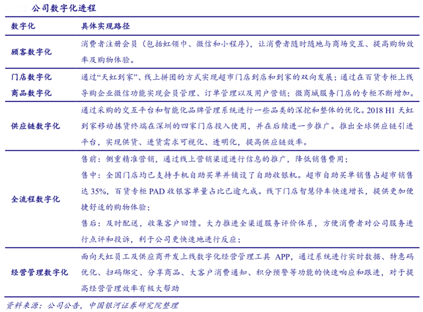 經(jīng)典案例:根據(jù)公司公告、中國銀河證券研究院等綜合資訊表明,經(jīng)過長(zhǎng)期數(shù)字化推進(jìn),天虹目前已全面實(shí)現(xiàn)會(huì)員、商品、營銷、服務(wù)的數(shù)字化和經(jīng)營管理數(shù)字化,不僅通過線上 拼團(tuán)、天虹到家、微信導(dǎo)購實(shí)現(xiàn)終端超市、百貨門店的數(shù)字化服務(wù),還通過數(shù)字化技術(shù)改善供 應(yīng)鏈,為中后臺(tái)的供應(yīng)商賦能。