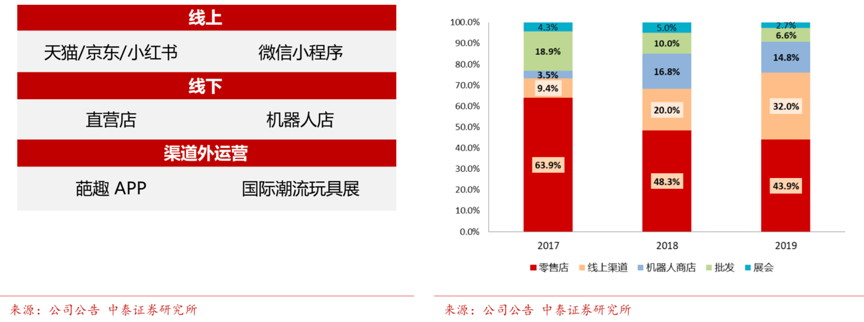 經典案例:根據公司公告、中泰證券研究所等綜合資訊表明,截至到 2019 年末,泡泡瑪特的零售店、線上和機器人商店的渠道銷售占比分別為 43.9%/32%/14.8%,同比收入增速分別為 198%/424%/188%,均保持了高速增長,其中線上收入的增速最快,其全渠道銷售、全場景互動的“消費者心智格局”基本形成。