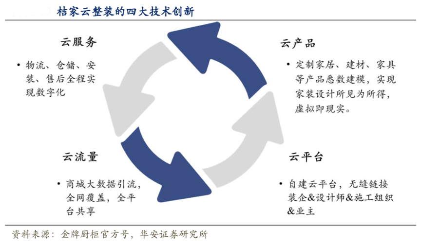 經典案例:根據金牌櫥柜官方號、華安證券研究所等綜合資訊表明,金牌櫥柜于2019 年開設了兩家桔家云整裝的直營門店。其將以公司櫥、衣、木產品作為核心,整合其他家居品類,為中小家裝公司及設計工作室提供供應鏈支撐。金牌桔家云整裝的六大核心優勢體現在精耕整裝的專業優勢、全屋定制的產研優勢、建材家具的精選優勢、一鍵打通的效率優勢、平臺模式的發展優勢以及上市公司的資金優勢。桔家云整裝的四大技術創新包括云產品、云 平臺、云流量和云服務。