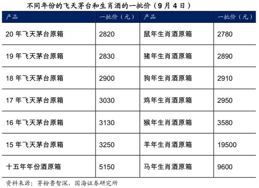 經典案例:根據茅粉魯智深、國海證券研究所等綜合資訊表明,對于茅臺酒來說, 隨著年份的增長,茅臺酒價格也在相應提高,而對于生肖紀念酒等非標酒,很多只在特定年份生產,稀缺性和紀念意義較強,也具有更強的時間溢價效應。