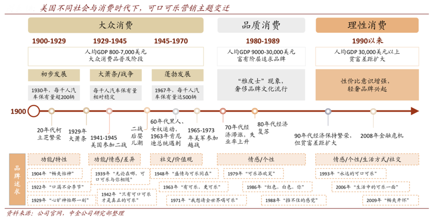 經典案例:根據公司官網、中金公司研究部等綜合資訊表明,1990年以來,美國消費逐漸理性,可口可樂更強調以情感/個性/生活方式/社交等為內在要素傳遞 品牌文化??煽诳蓸窂V告主題的變遷展示了品牌的建立過程,亦展示了美國社會和消費環境的演變過程。