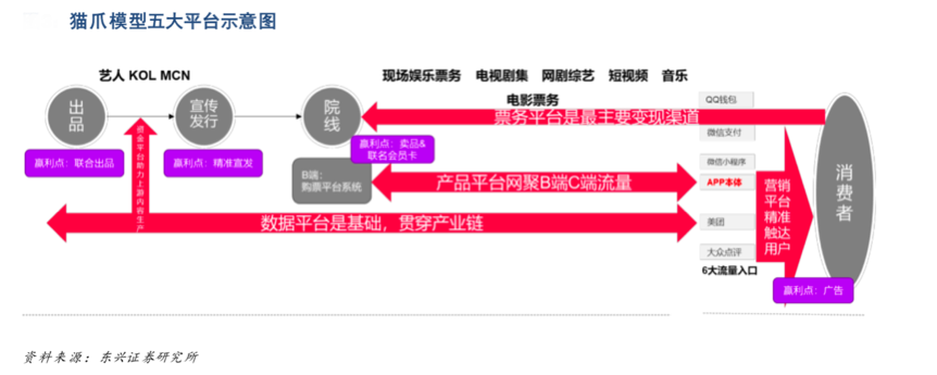經典案例:根據東興證券研究所等綜合資訊表明,產品平臺是“貓眼娛樂”之貓爪模型戰略落地執行的關鍵。五大平臺的戰略地位各司其職,資金平臺通過投資的手段支持內容布局,數據平臺作為核心賦能全產業鏈,營銷平臺在初期輔助傳 播,后期觸達用戶成為商業化 變現工具,票務平臺作為最主要的業務模式串聯院線資源,反哺內容的創作,同而產品平臺則是數據,流量及業務產生和流轉的基礎,對于貓眼的商業模式是中流砥柱的作用。