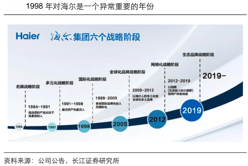 經典案例:根據公司公告、長江證券研究所等綜合資訊表明,1998 年,海爾品牌走上了“國際化之路”,對內進行“業務流程再造”,矩陣式組織及扁平化渠道的治理和業務模式便始于此;對外海爾也開始推進其國際化戰略。一段國際化征程正式開啟。