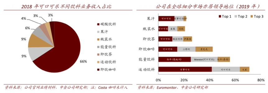 經典案例:根據公司官網、中金公司研部等綜合資訊表明,全球范圍內,可口可樂不僅是碳酸市場龍頭,在細分市場亦處領導地位。根據 Euromonitor,2019 年公司在全球的果汁、瓶裝水、即飲茶、咖啡等品類中均位居第一,在能量與運動飲料中排名第二。