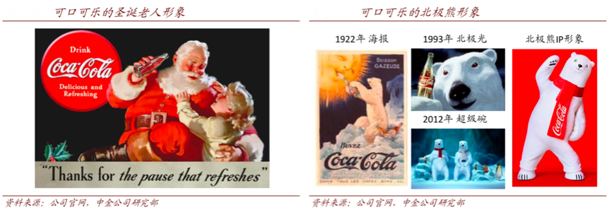 經典案例:根據公司官網、中金公司研部等綜合資訊表明,可口可樂成功重塑了圣誕老人和北極熊等 IP 形象,進一步豐富品牌文化。自 1920 年起可口可樂開始在圣誕節展開營銷活動,拓寬消費場景至冬季,并放大品牌IP價值。