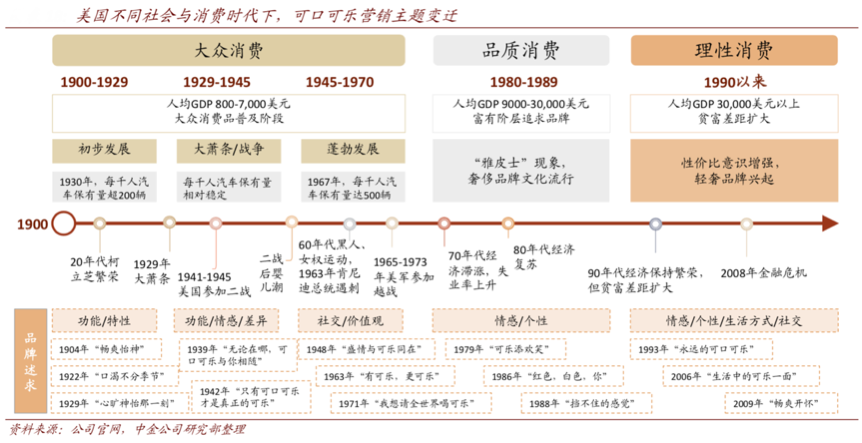 經典案例:根據公司官網、中金公司研部等綜合資訊表明,1990年以來,美國消費逐漸理性,可口可樂更強調以情感/個性/生活方式/社交等為內在要素傳遞 品牌文化,可口可樂廣告主題的變遷圓滿展示了品牌與時俱進、高效互動的過程。