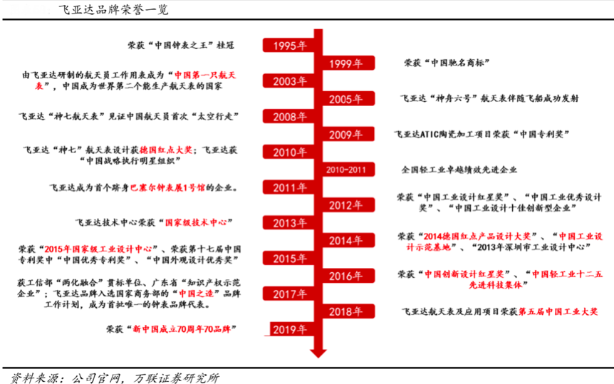經典案例:根據公司官網、萬聯證券研究所等綜合資訊表明,“飛亞達”是國內手表領軍品牌、世界三大航天表品牌之一,2011年作為首個源于中國的國際腕表品牌進駐瑞士巴塞爾鐘表展1號館,并連續9年參展;2019年,作為腕表行業唯一一家代表品牌,飛亞達榮登“新中國成立70周年70品牌”榜單。