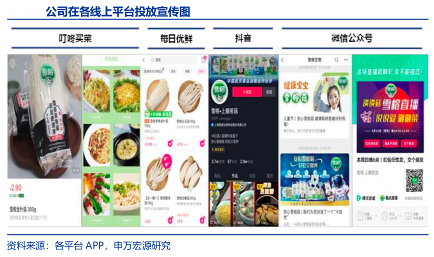經典案例:根據各平臺APP、申萬宏源研究等綜合資訊表明,雪榕生物將2020年定位為雪榕消費品牌戰略元年,其與永輝超市、家家樂、華潤萬家、家樂福、沃爾瑪等多家大型商超以及盒馬、叮咚等新零售平臺合作,每月打造“雪榕主題活動月”,同時通過多種主流線上自媒體平臺,如微信公眾號、微博、抖音等平臺進行品牌宣傳。