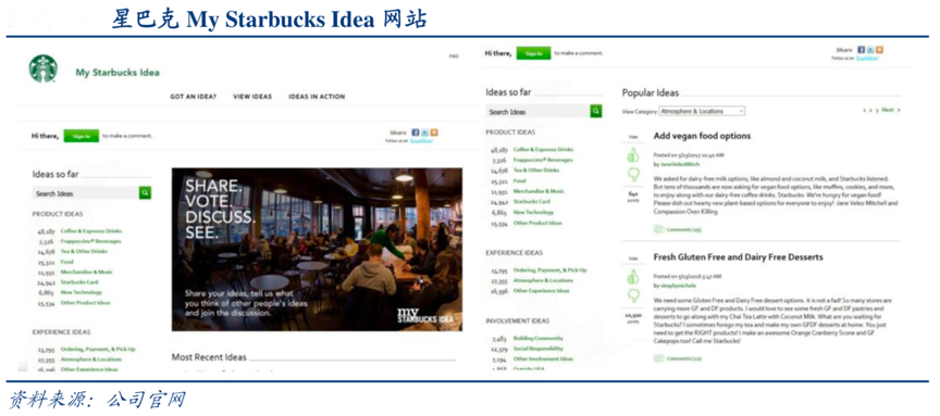 經(jīng)典案例:根據(jù)公司官網(wǎng)、華創(chuàng)證券等綜合資訊表明,星巴克 2008 年建立了 My Starbucks Idea 網(wǎng)站,收集顧客從產(chǎn)品口味、店內(nèi)體驗(yàn)、會(huì)員卡、店內(nèi)設(shè)計(jì)到企業(yè)社會(huì)公益等多個(gè)方面的想法,成功孵化的產(chǎn)品包括抹茶可可碎片星冰樂(lè),南瓜絲絨拿鐵等明星單品。