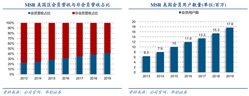 經(jīng)典案例:根據(jù)公司官網(wǎng)、華創(chuàng)證券等綜合資訊表明,星巴克 2008 年推出 My Starbucks Rewards 項(xiàng)目,會(huì)員通過(guò)消費(fèi)積分晉升等級(jí),其會(huì)員營(yíng)收占比逐年上升,2019 年美國(guó)活躍會(huì)員用戶數(shù)量達(dá)到 17.6 百萬(wàn)人,占用戶總數(shù)19%。
