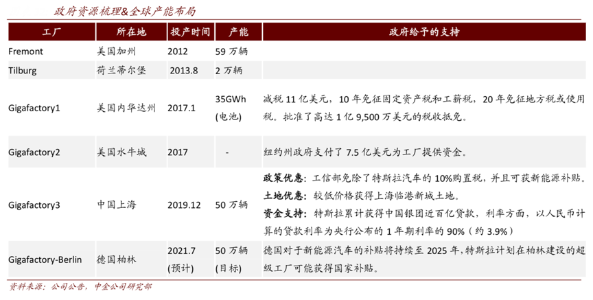 經典案例:根據公司公告、中金公司研究部等綜合資訊表明,特斯拉尋求當地資源加杠桿,降低制造成本,其產能布局全球,在美國、中國上海、德國 柏林等多地建立工廠,節省運輸成本,同時又可以享受到當地政府補貼,極大的匯聚了產業資源。