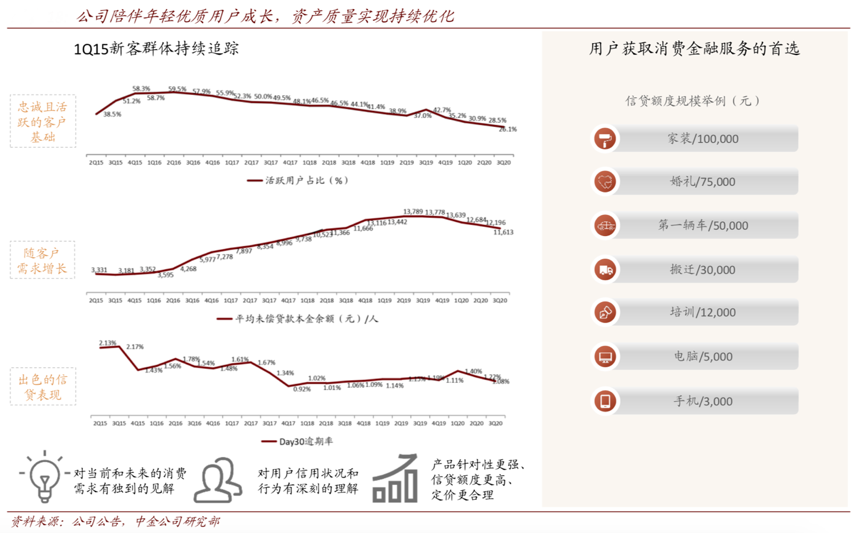 經典案例:根據公司公告、中金公司研究部等綜合資訊表明,樂信公司 2015 年的用戶群體, 隨著收入的增長及消費需求的變化,其自身獲得的借款額度也會慢慢提升,人均借款金 額從 2Q15 的 3,331 元增長至 3Q20 的11,613 元,同時這部分用戶群體的資產質量也在持續改善,30 天逾期率從 2Q15 的 2.13%降至 3Q20 的 1.08%。