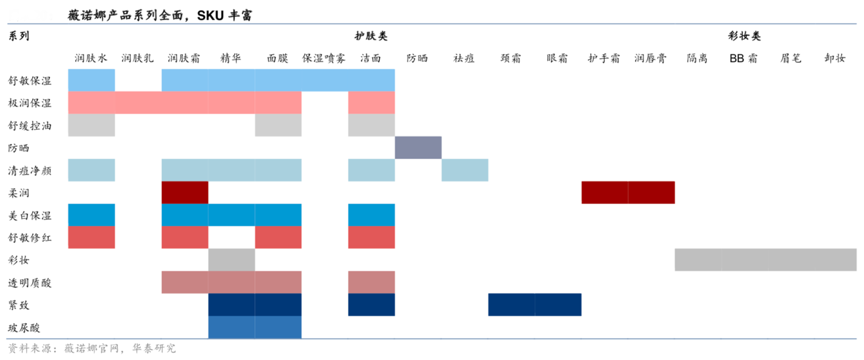 經(jīng)典案例:根據(jù)薇諾娜官網(wǎng)、華泰研究等綜合資訊表明,2005年6月貝泰妮聯(lián)合昆明醫(yī)科大學(xué)第一附屬醫(yī)院皮膚科、中國(guó)科學(xué)院昆明植物研究所,通過(guò)醫(yī)、產(chǎn)、學(xué)、研結(jié)合, 從云南6000多種植物中,選出青刺果、馬齒莧、滇重樓、滇山茶作為產(chǎn)品的四大核心成分,并進(jìn)行12000次以上的肌膚實(shí)測(cè)驗(yàn)證,2008 年薇諾娜首次于第四屆中國(guó)皮膚科醫(yī)師年會(huì)上亮相。基于舒敏藥理理念, 旗下產(chǎn)品涵蓋舒敏保濕、舒緩控油、透白、極潤(rùn)、緊致,防曬等 12 個(gè)系列,69 種單品。