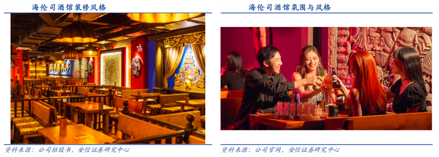 經典案例:根據公司招股書、公司官網、安信證券研究中心等綜合資訊表明,海倫司酒館酒館造型設計上同時采用了中國古典風格和自然原生態風格,在店內營造溫暖親和的氛圍。酒館內所用的所有用品,包括桌椅、燈具和飾品,都經過專業的內部設計團隊精 心挑選,選取鏤空木花等風格明顯的飾品、木質桌椅為特色。其在廣東深圳及湖北武漢經營兩家原型店面,酒館裝潢風格不斷迭代,從1.0 版、2.0 版逐漸形成了目前以標準化、工業化和模塊化為特色的的 3.0 版裝潢風格。