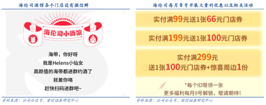 經典案例:根據公司公眾號、安信證券研究中心等綜合資訊表明,海倫司在提供零售服務以外,目前其逐步打造了文化、精神以及社交的體驗。主要采用社區運營的模式,強化了用戶粘性與體驗,其中各個門店設有微信群,海倫司通過進行社群運營,籠絡了一大群高粘性的用戶群體;每逢重大節假日以及每月 9 號,海倫司總會開展很多優惠活動,比如免費 2 小時、各類抽獎或優惠券等。