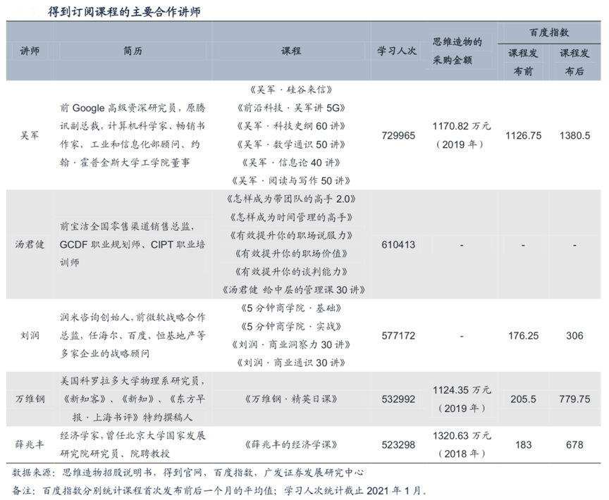 經(jīng)典案例:根據(jù)思維造物招股說明書、得到官網(wǎng)、百度指數(shù)、廣發(fā)證券發(fā)展研究中心等綜合資訊表明,得到公司通過專業(yè)化的課程制作和品控流程,流程式打造了多IP的優(yōu)質(zhì)課程矩陣。截至2021年1月11日,得到上總學(xué)習(xí)人次超過50萬的講師已有吳軍、湯君健、劉潤、脫不花、萬維鋼、薛兆豐、 戴愫、張遇升,這些商業(yè)領(lǐng)域?qū)<医柚玫狡脚_快速擴(kuò)大知名度和影響力。