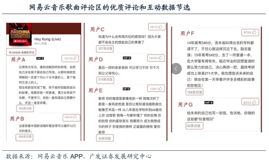 經(jīng)典案例:根據(jù)網(wǎng)易云音樂APP、廣發(fā)證券發(fā)展研究中心等綜合資訊表明, 2021年2月,聽眾有48%瀏覽了評論區(qū),評論區(qū)成為用戶生產(chǎn)內(nèi)容的入口之一,是網(wǎng)易云音樂在早期區(qū)別于其他音樂產(chǎn)品的差異化功能之一。評論區(qū)的內(nèi)容數(shù)量和質(zhì)量都保持較高水準(zhǔn),用戶基于評論產(chǎn)生了較強的互動。以劉聰?shù)拇碜鳌禜ey Kong》的歌曲評論區(qū)為例,截止2021年6月1日,這首歌累計有 6萬+條用戶產(chǎn)生的評論,點贊數(shù)排名靠前的評論點贊量也超過了6萬,同時還有數(shù)百條用戶回復(fù),高質(zhì)量的評論區(qū)成為用戶和歌手的精神樂園。