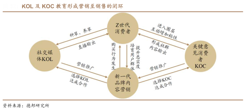 經典案例:根據德邦研究所等綜合資訊表明,新品牌依托線上內容營銷打造品牌路徑,KOL 作為品牌傳播中的重要角色,品牌、KOL及消費者組成 的黃金三角構成了成分黨的生態。隨著 KOL 不斷的細化,社群經濟逐漸興起, KOC 入場參與到產品營銷環節,通過形成小的圈層,KOL及KOC教育形成營銷至銷售的閉環。