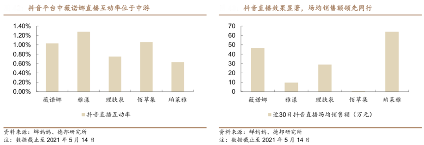 經典案例:根據蟬媽媽、德邦研究所等綜合資訊表明,貝泰妮公司旗下品牌薇諾娜在抖音已有55.2萬粉絲,抖音直播互動率為 1.03%,略次于雅漾的 1.28%及佰草集的1.06%;從場均銷售額角度來看,薇諾娜在可比公司中實現領先,場均銷售額達到 46.6.萬,僅次于珀萊雅的 64 萬。