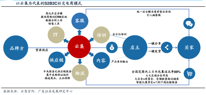 經(jīng)典案例:根據(jù)云集官網(wǎng)、廣發(fā)證券發(fā)展研究中心等綜合資訊表明,云集早前S2B2C社交電商模式核心在于平臺(tái)(S)作為核心整合供應(yīng)鏈并賦能店主 (B),構(gòu)建品牌方(產(chǎn)品)和買(mǎi)家(C)的新鏈路。其中云集平臺(tái)集成標(biāo)準(zhǔn)化中后臺(tái)供應(yīng)鏈服務(wù),店主則僅負(fù)責(zé)前端分享引流,形成熟人背書(shū)的社交銷(xiāo)售“場(chǎng)”。