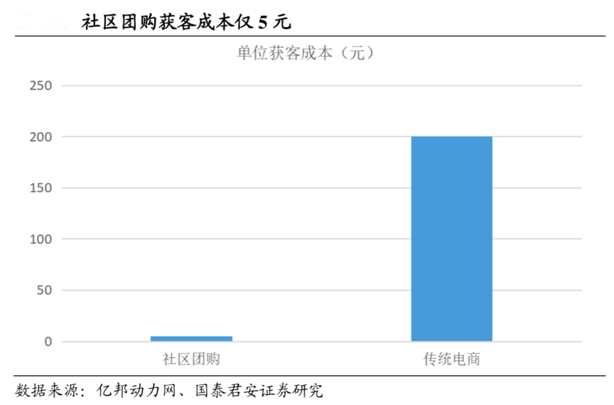 經典案例:根據億邦動力網、國泰君安證券研究等綜合資訊表明,傳統超商或農貿市場流量多為附近居民,社區團購屬于社交電商,團長將朋友、鄰居拉入微信群,同時小程序鏈接通過多次轉發可以達到流量裂變的效果。結合億邦動力網數據,傳統電商和社區團購獲客成本分別為 200 元、5元,獲客成本十分低廉。