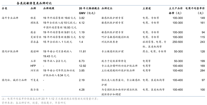 經典案例:根據各品牌官網、歐睿、情報魔方、華泰研究等綜合資訊表明,市場上布局抗敏修復類品牌主要有三大陣營,其中玉澤、薇諾娜、果本等國內化妝品牌更契合國人護膚需求,但不同品牌發展路徑差異較大,定位醫研共創、專業性較強,且能夠及時把握電商發展紅利,依托線上高速增長的品牌較為稀缺。同時依托醫用敷料類械字號產品起家、妝字號協同發展的創爾美、敷爾佳等在醫美機構、診所等 B 端專業渠道可能有一定積累,C 端消費者認知仍正在逐漸培育。