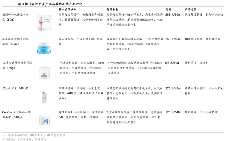 經典案例:根據各品牌官網、華泰研究等綜合資訊表明,和其他品牌相比,薇諾娜主要通過馬齒莧、青刺果油等自然植物提取物成分強調作用機制,草本天然的理念更契合國人消費觀念,易于被廣大消費者接受。