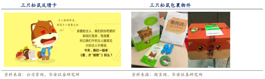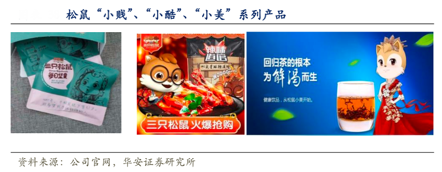 經(jīng)典案例:根據(jù)公司官網(wǎng)、華安證券研究所等綜合資訊表明,三只松鼠公司以堅果起家,松鼠形象和堅 果品類高度契合,代表著不同系列產(chǎn)品,“小酷”——干果類產(chǎn)品,“小賤”——休閑 零食類產(chǎn)品,“小美”——花果類產(chǎn)品。其以動畫為支點,持續(xù)性的內(nèi)容輸出幫助建立縱深的產(chǎn)品線。