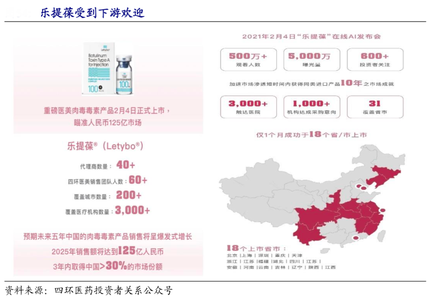 經典案例:根據四環醫藥投資者關系公眾號、開源證券研究所等綜合資訊表明,2014 年四環醫藥與 Hugel 公司簽訂合作協議,旗下肉毒素產品樂提葆 2020 年 10 月在我國獲批,四環醫藥在中國具有獨家經銷權。從產品方面看,樂提葆(俗稱“白毒”)是韓國市占率排名第一的肉毒素產品,產品彌散度小且價格略低于保妥適,與目前市場上其他三款產品可以實現錯位競爭,有望搶占肉毒素藍海市場。
