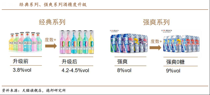 經(jīng)典案例:根據(jù)天貓旗艦店、德邦研究所等綜合資訊表明,百潤股份公司酒精度數(shù)向高度數(shù)延伸,覆蓋更廣泛客群。2020年,其對經(jīng)典系列進行產(chǎn)品升級,除包裝升級外,酒精度數(shù)從原來的 3.8%vol 上升至 4.2-4.5%vol。在強爽系列取得較好反響后,2021年其推出強爽 0 糖系列,在原基礎上度數(shù)+1,整體 呈現(xiàn)高度數(shù)升級的趨勢。