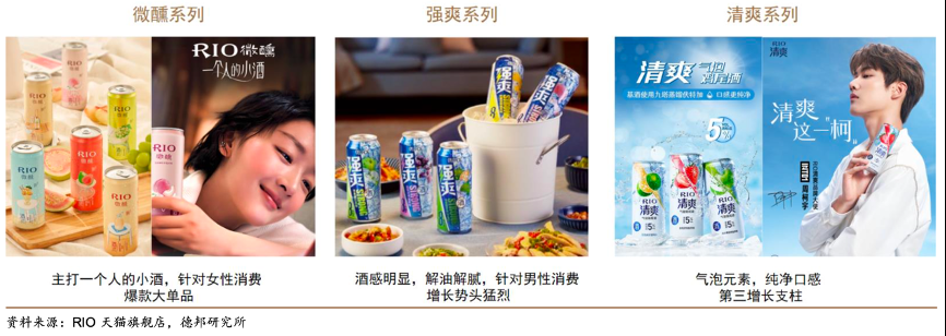 經(jīng)典案例:根據(jù)RIO天貓旗艦店、德邦研究所等綜合資訊表明,2018年微醺系列升級,主打“一個人的小酒”場景定位,精準定位個人獨飲,關 注女性消費群體,加之消費場景的宣傳培育,微醺系列成為爆款大單品。2016 年公司針對男性消費群體推出強爽系列,酒精度提升到 8%vol,酒感更明顯,定位重油重辣餐飲消費。