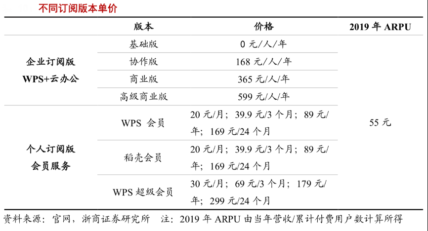 經(jīng)典案例:根據(jù)官網(wǎng)、浙商證券研究所等綜合資訊表明,由于銷售過程伴隨著優(yōu)惠、渠道分傭,根據(jù)當(dāng)年營收/累計付費用戶數(shù)計算所得,目前金山辦公訂閱用戶會員客單價約為 55 元。隨著公客戶粘性的持續(xù)提升、話語權(quán)提高,以及新增功能模塊,中小企業(yè)市場云辦公的大力拓展,中長期機構(gòu)、個人訂閱客單價有望提升至 250 元/年和 130 元/年。
