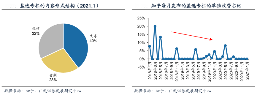 經典案例:根據知乎、廣發證券發展研究中心等綜合資訊表明,鹽選專欄是創作者提供的訂閱內容。截止2021年1月,3635場鹽選專欄形式分別為文字內容(占比39.7%)、音頻內容(占比28.3%)、 視頻內容(占比32.0%),其中知乎獨家或自制的內容占比達到28.2%。內容類別涵蓋科學、財商、故事、親子等等,故事專欄的熱度最高,熱度總榜TOP100中有87個故事專欄。目前94.8%的鹽選專欄對鹽選會員免費開放,隨著時間推移,鹽選專欄逐漸向輕度化、泛娛樂內容發展,專欄的單獨收費比例也隨之降低。