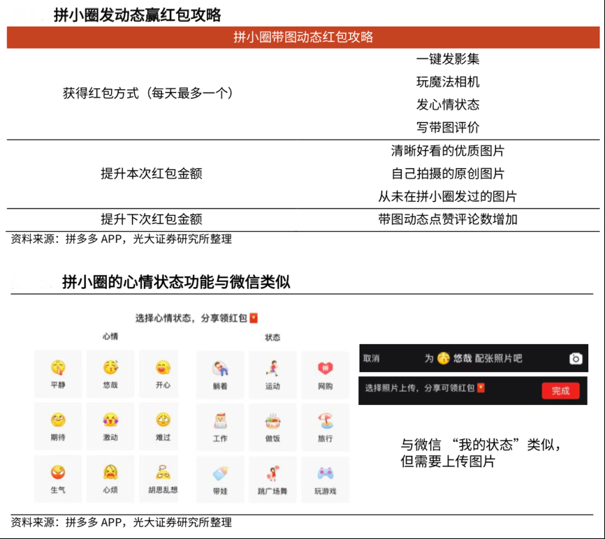 經典案例:根據拼多多APP、光大證券研究所等綜合資訊表明,用戶通過拼小圈可以獲得帶圖動態紅包和帶貨紅包:1)帶圖動態紅包可以由一鍵發影集、玩魔法相機、發心情狀態、寫帶圖評價四種方式獲得,單用戶每天最多可得一個帶圖動態紅包。2)帶貨紅包主要由他人通過自身分享的購買鏈接購買同系列產品獲得。