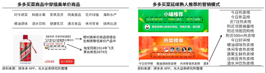 經典案例:根據拼多多APP、光大證券研究所等綜合資訊表明,多多買菜延續熟人推薦的營銷模式,設有小編推薦、熱賣榜單等板塊,其中熱賣榜單除了按產品分類外,還設有附近鄰居銷量榜、附近鄰居回購榜、附近 500m 熱賣榜等欄目。用戶參考鄰居購買記錄將降低某一社區周邊 SKU 數,提高單 SKU 銷量,從而在一定程度上降低履約成本。