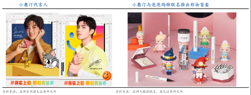 經典案例:根據品牌官網、品牌天貓旗艦店、國元證券研究所等綜合資訊表明,小奧汀在營銷打法上與完美日記類似,在短時間內合作多個KOL,集中引爆品牌聲量。根據卡思數據統計,截至 2020 年 10 月 13 日,共計有3500+KOL/KOC 發布關聯小奧汀商品的視頻,數量達近萬只。并于2019 年 9 月官宣火箭少女 101 的 Sunnee 為唇妝代言人, 2020 年 8 月官宣新生代演員陳飛宇為品牌代言人,9 月官宣王霏霏為高光大使,。此外品牌積極進行熱門 IP 聯名,先是合作貓和老鼠 IP 推出“奶酪腮紅”,后又與潮玩品牌泡泡瑪特共同推出了彩妝盲盒,熱門IP+創意趣味產品幫助品牌在短時間內塑造起深刻的消費者心智。