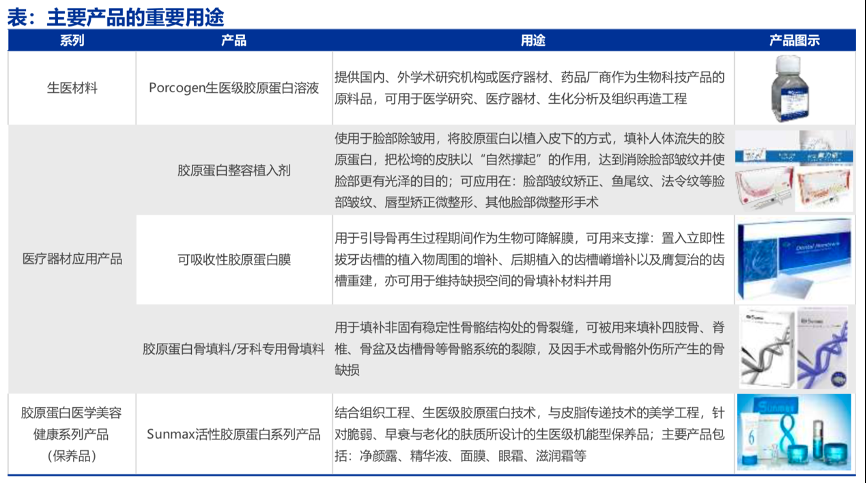 經典案例:根據雙美年報、雙美官網、申萬宏源研究等綜合資訊表明,雙美公司旗艦產品為“膚力原”“膚麗美”“膚柔美”植入劑,同時布局了膠原蛋白醫 療器材原料等醫療器械,以及凈膚露、精華液、滋潤霜、面膜等美容產品,潛在業務發展空間龐大。