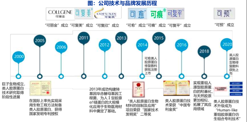 經典案例:根據巨子生物公眾號、申萬宏源研究等綜合資訊表明,巨子生物公司以重組人膠原蛋白生物制造技術、高活性天然產物生物制造技術、新型生 物醫用材料制備技術為主導,聚焦生物護膚品、醫療器械、營養食品 和預防醫學產品三大健康產業方向,其自主研發的“類人膠原蛋白”是世界上首次成功研發并產業化的重組人源膠原蛋白。