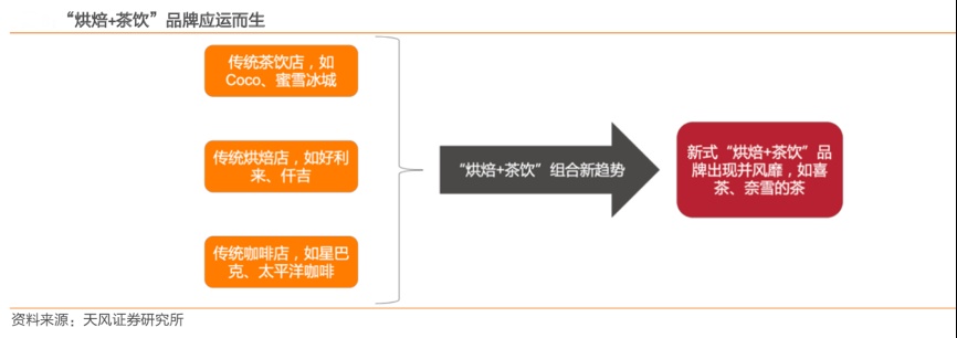 經典案例:根據中國烹飪協會《2017年度美食消費報告》、天風證券研究所等綜合資訊表明,70后、80后、90后餐飲消費中,蛋糕甜品店訂單占比分別為1%、7%、25%,年輕一代飲食西化的趨勢已經出現。咖啡廳、蛋糕甜品店逐漸成為年輕人休閑放松的主要場所,“飲品+烘焙”成為下午茶主流。在這種趨勢下,喜茶、奈 雪的茶、樂樂茶這類以新式茶飲+烘焙為主要產品體系的品牌應運而生,星巴克、太平洋 咖啡等上線的烘焙產品數量逐漸增加。