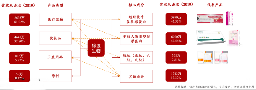 經典案例:根據錦波生物招股說明書、公司官網、浙商證券研究所等綜合資訊表明,錦波生物創立于2008年,其作為抗病毒功能蛋白締造者+人源化新材料開拓者,建立從原料到醫療終端產品及功能性護膚品的全產業鏈業務體系。2019年,錦波生物實現原料收入59萬,營收占比0.42%,以原料為基礎,醫療器械、化妝品、衛生用品終端產品合計實現收入1.4億元,占比99.58%,其中醫療器械和化妝品貢獻主要營收。