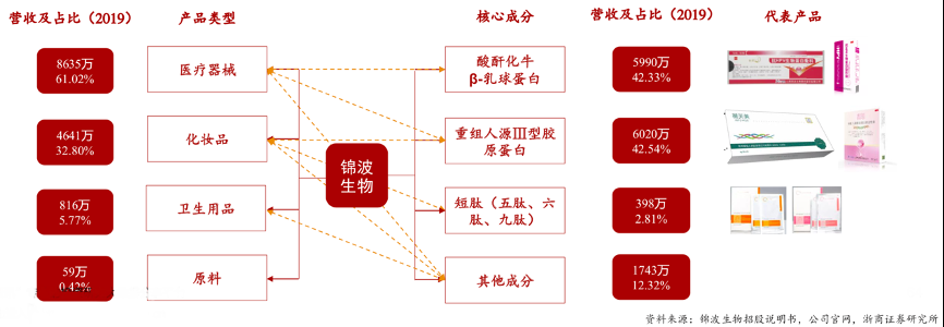 經典案例:根據錦波生物招股說明書、公司官網、浙商證券研究所等綜合資訊表明,錦波生物建立從原料到醫療終端產品及功能性護膚品的全產業鏈業務體系,2019年,其實現原料收入59萬,營收占比0.42%,以原料為基礎,醫療器械、化妝品、衛生用品終端產品合計實現收入1.4億元,占比99.58%,其中醫療器械和化妝品貢獻主要營收。
