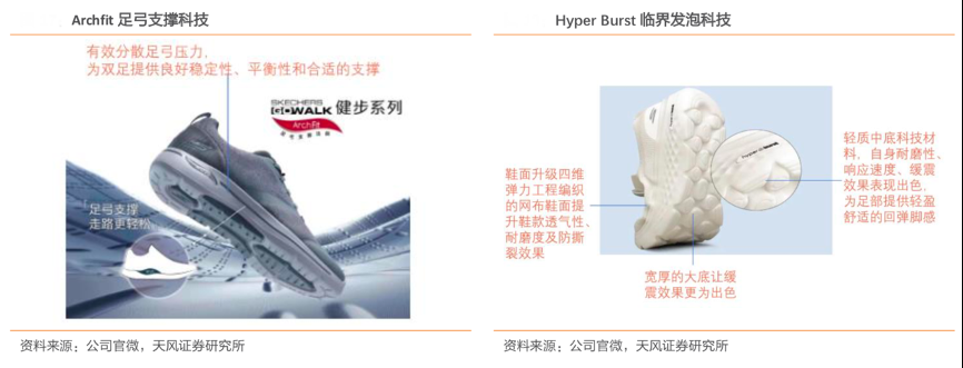 經(jīng)典案例:根據(jù)公司官微、天風(fēng)證券研究所等綜合資訊表明,斯凱奇致力于舒適科技的追求創(chuàng)新和升級,其推出的GOWALK Arch Fit 系列首次使用了 Arch Fit 足弓支撐技術(shù),該技術(shù)由美國足部醫(yī)師在過去 20 年中通過對 12 萬條足部掃描數(shù)據(jù)分析研究得出,能有效分散足弓壓力并且提供良好的穩(wěn)定性、平衡性和合適的支撐力。